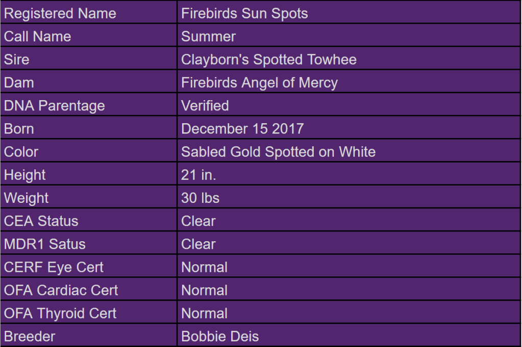 Summer was born December 15, 2017. She is from our Seeing Spots Litter
