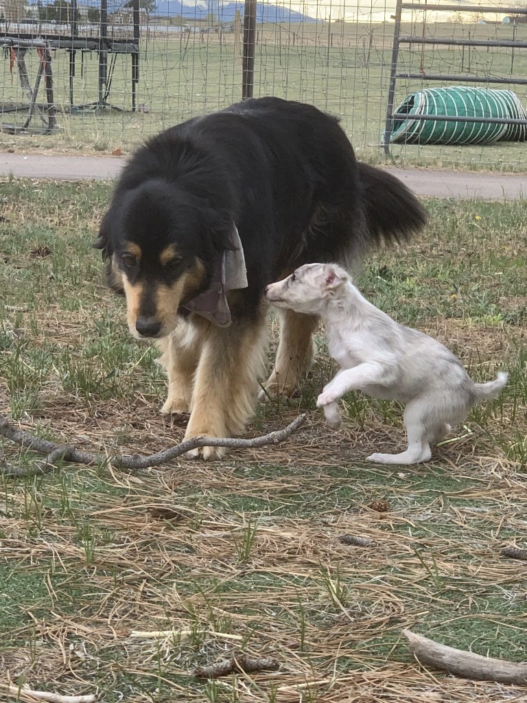 These five help out with puppy raising! Our “big floof,” Rosie, is a large gentle Berner/Aussie mix. Her job is to show the puppies that big dogs aren’t scary, not all dogs have long noses, and help them explore with confidence. Kissa and Merlin (our resident little dogs) teach them that small dogs should be respected, even if they are puppy-sized. Our friendly barn cats, Paige and Piper, have an important job in socializing our puppies, too. Its their job to teach the puppies that cats should be approached politely and not chased, can be sniffed but not chewed, and most importantly, that cats do not communicate or behave like dogs do.