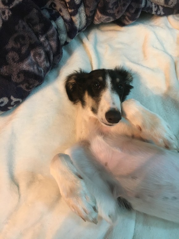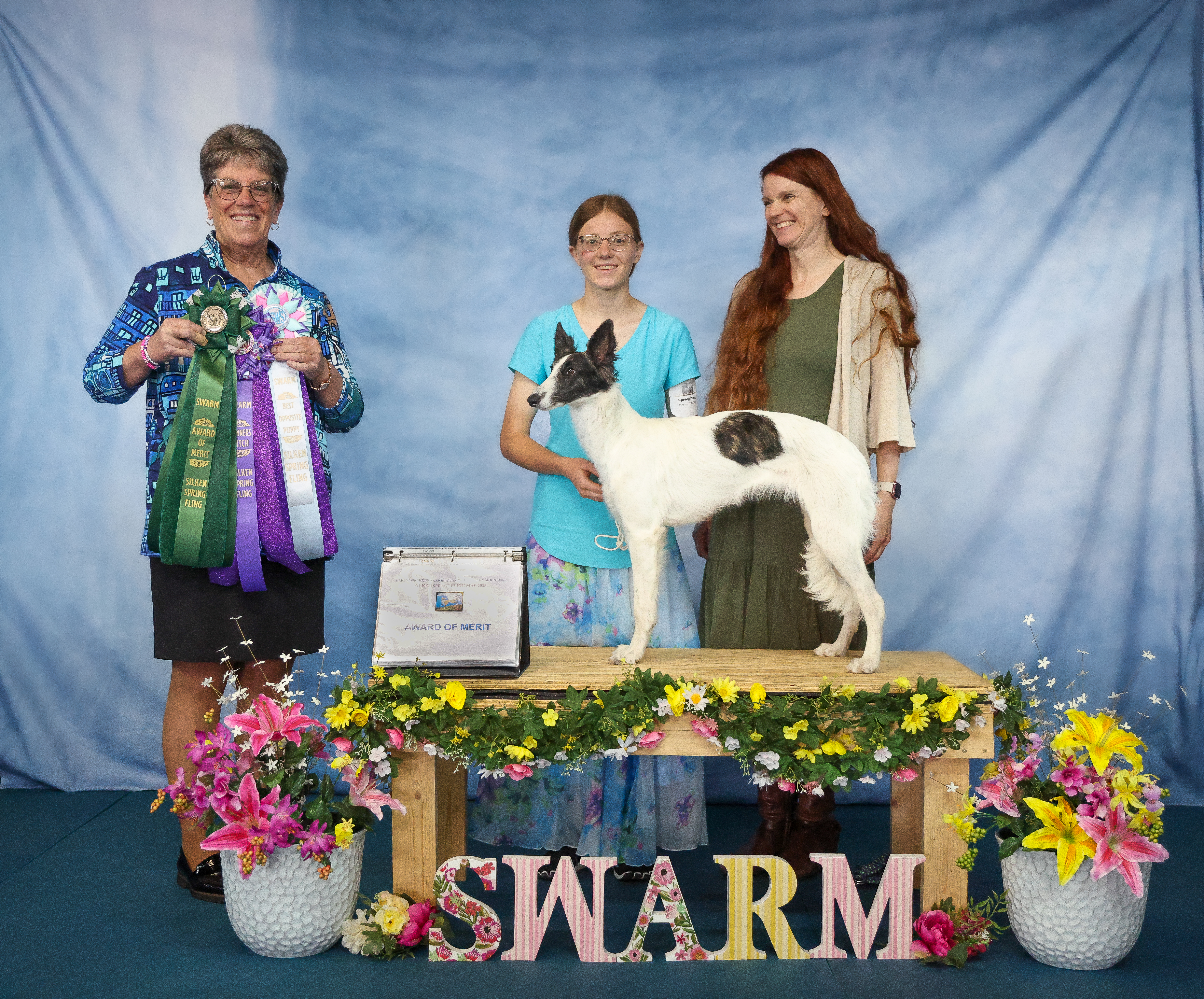 At the Spring Fling specialty show, Leopard got a Reserve Winners female on the first day (to go with her Best in Specialty Show and Winners female from last fall) and Kazenka got an Award of Merit, Winners female, and Best Opposite Puppy on the second day.