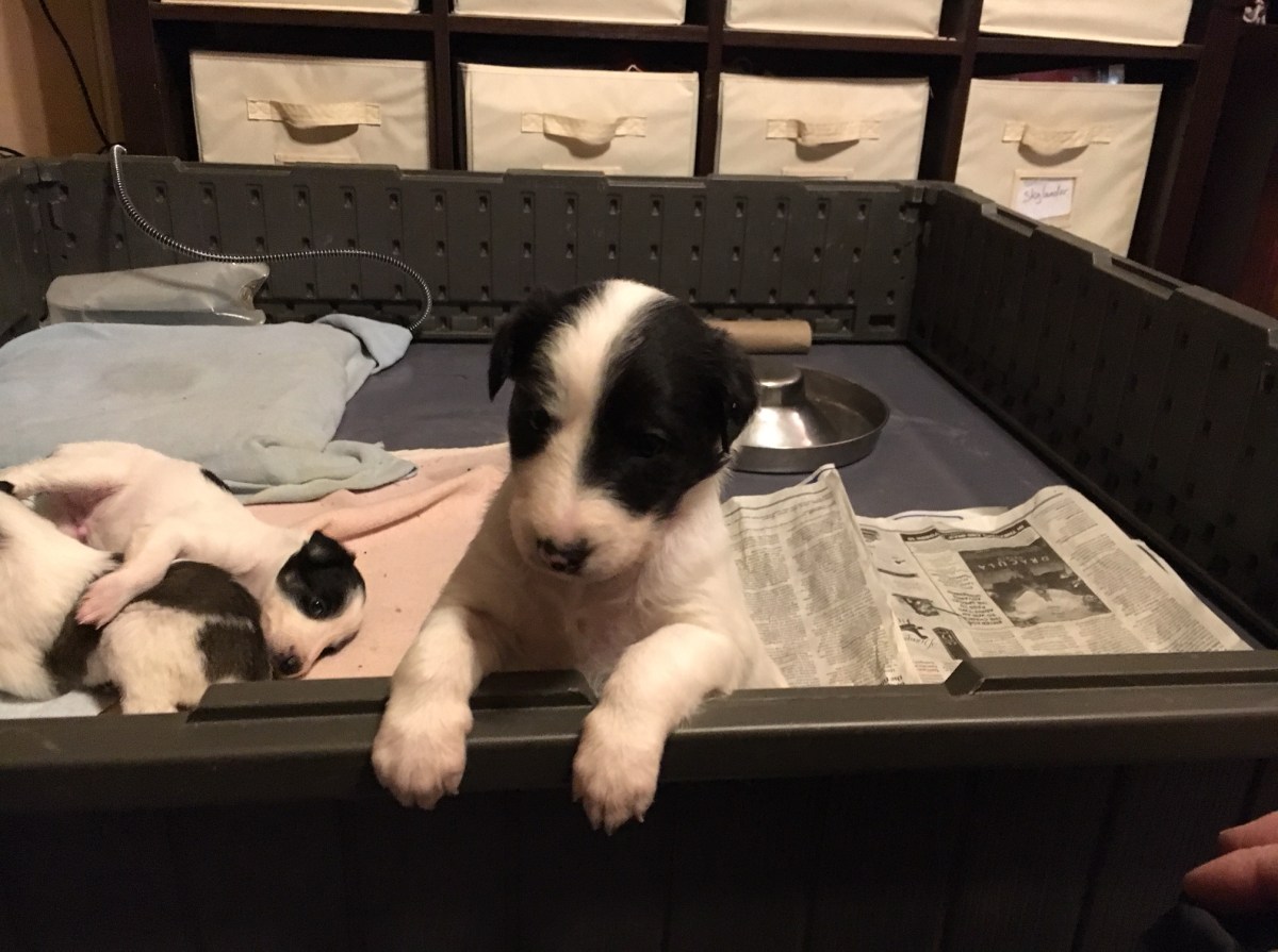 Our “seeing spots” puppies are getting their first taste of goat milk with rice cereal as they are growing so fast. They are also moving into the living room to be part of the hustle and bustle of our house. During their 3rd week, the girls figured out how to climb over the whelping box wall to seek out their momma. The pups also met several new people along with Great Aunt Tsarina, Grandma Sparrow, and Isabeau.
